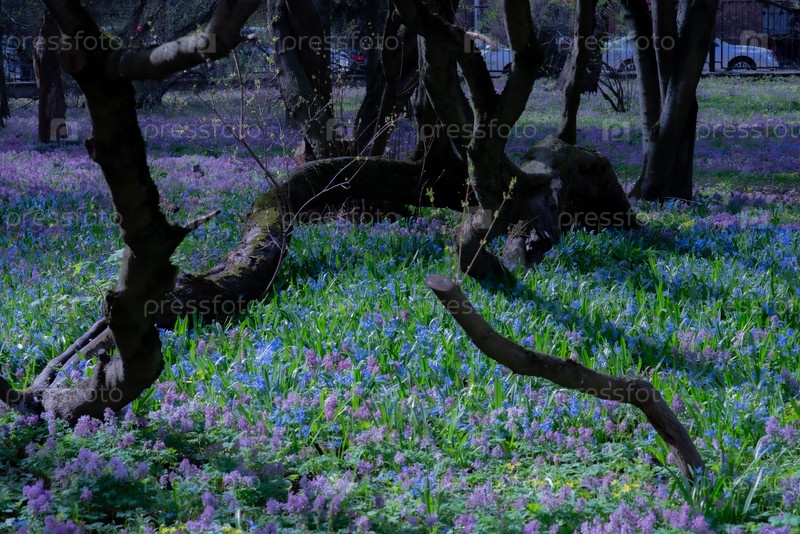 Поле фиолетовых цветов, ствол дерева