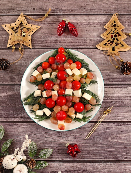 Рождественские и новогодние блюда, традиционный праздничный салат в виде живого съедобного дерева с сыром фета, оливками, помидорами и виноградом, ветвями елей и ювелирными изделиями, идея дизайна пищи
