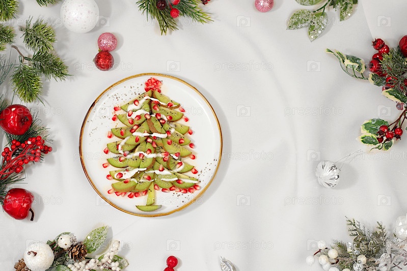Съедобная рождественская елка из киви и граната на праздничном столе, идея дизайна пищи и украшения новогодних блюд для детей