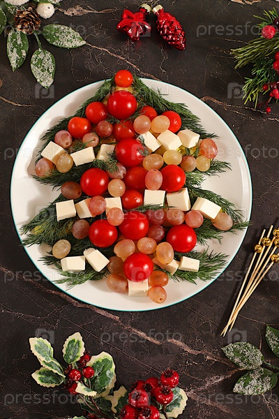 Рождественские и новогодние блюда, традиционный праздничный салат в виде живого съедобного дерева с сыром фета, оливками, помидорами и виноградом, ветвями елей и ювелирными изделиями, идея дизайна пищи