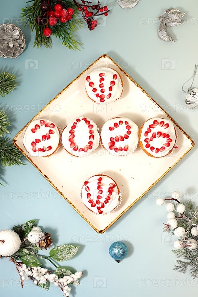 Рождественские и новогодние блюда. чертовы кексы с гранатами, глазированные цифрами 2026 для праздничного стола. идея разработки еды и новогодних блюд для детей