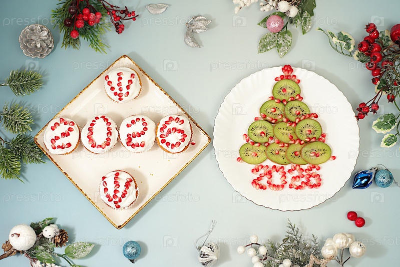 Сырные кексы с гранатами в глазуре с номерами 2026 и киви на праздничный стол, идея для украшения еды и декорирования новогодних блюд для детей
