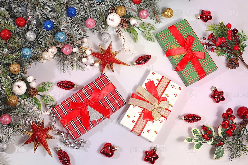Подарочные коробки на праздничном фоне с рождественскими украшениями, концепция новогодних продаж и покупок, Черная пятница, баннер продвижения магазина и шаблон экрана