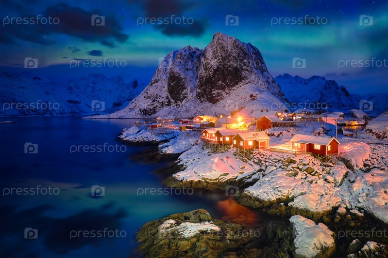 Известная туристическая достопримечательность рыбацкая деревня Хамна на Лофотенских островах, Норвегия с красными домами руербу в зимний снег освещается вечером от северной сияния