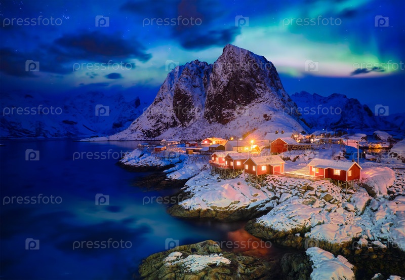 Известная туристическая достопримечательность рыбацкая деревня Хамна на Лофотенских островах, Норвегия с красными домами руербу в зимний снег освещается вечером от северной сияния