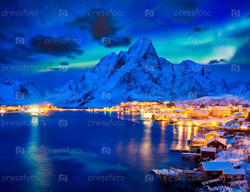 Деревня Рейна ночью.Острова Лофотен, Норвегия
