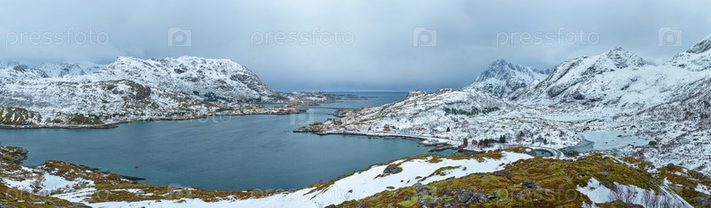 Панорама норвежского фьорда зимой, Острова Лофотен Норвегия