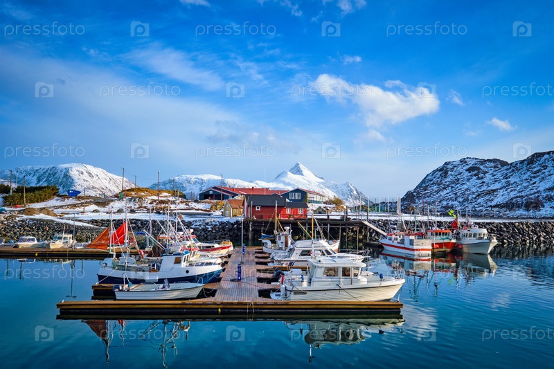 Рыболовные лодки и яхты на пирсе в норвежском фьорде в деревне на Лофотенских островах зимой, Норвегия