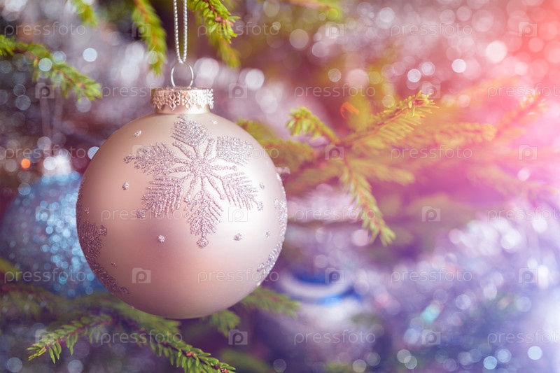 Рождественский фон - украшение рождественской елки на декорированной рождественской елке с размытыми туманными огнями боке и кописпалом