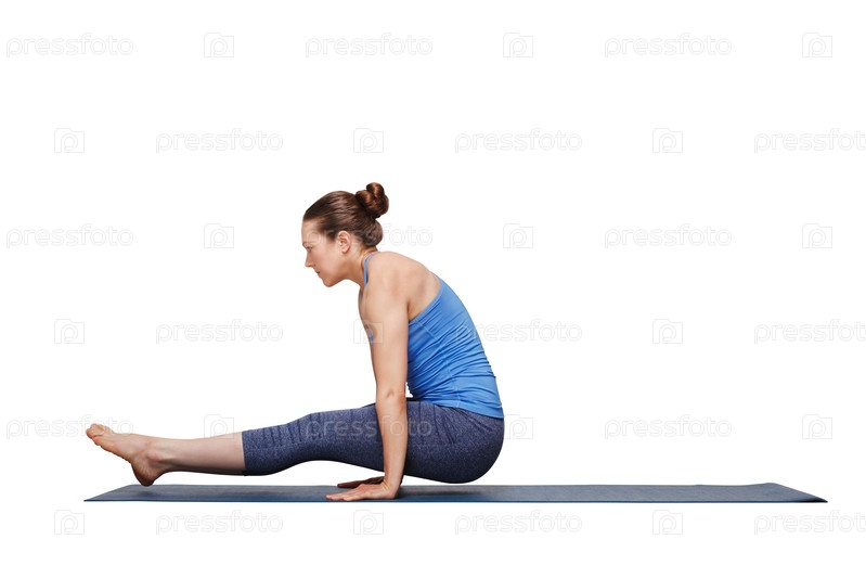 Женщина, выполняющая хата-асану Utpluti-dandasana - поднятые вещи позируют изолированно на белом фоне