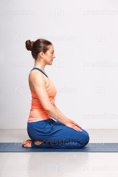 Женщина в атха-йоге асана vajrasana - ваджра поза или бриллиантовая поза на йога-матке на йога-мате в студии на сером поле для мешков