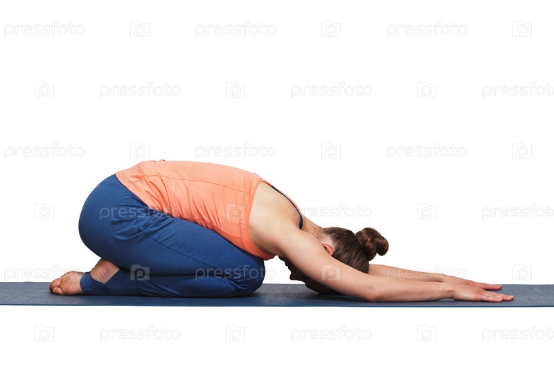 Женщина отдыхает в хата-йога асане Баласана - положении ребенка в позе покоя или противоположной асане для многих асан, изолированных на белом