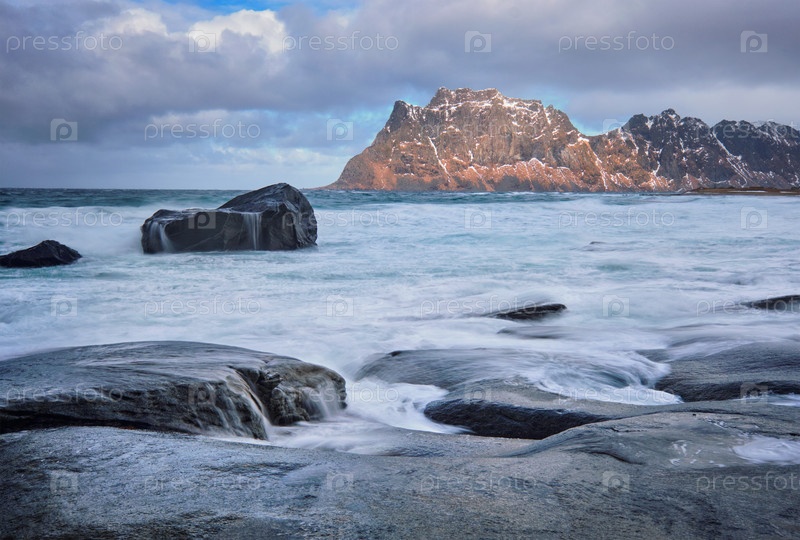 Скалы на фьордовом пляже Норвежского моря зимой со снегом