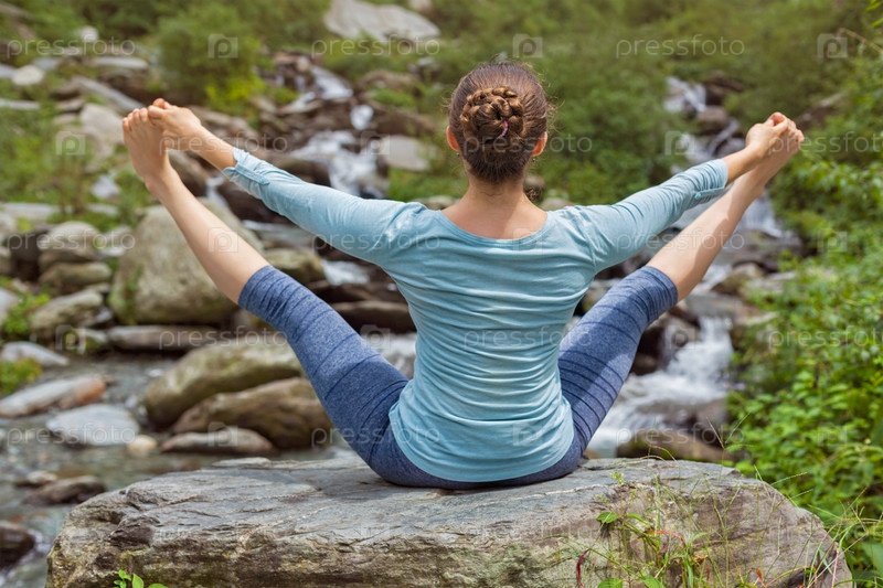 Женщина занимается Ашьябо Виньяс Йога Диа на открытом воздухе