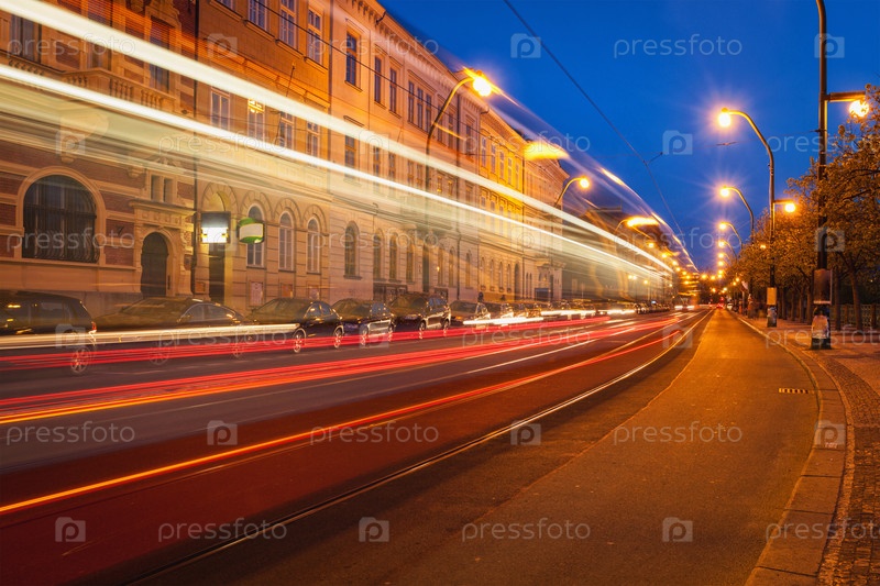 Размытые световые следы пражского трамвая Прага, Чехия