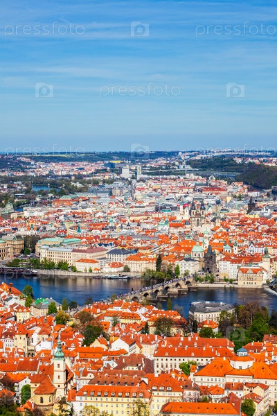 Вид на Карловый мост через реку Влтаву и Старый город с Петри