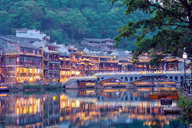 Туристическая достопримечательность - древний китайский город Фэньхуань (Феникс) на реке Тяо Цзян с освещенным мостом