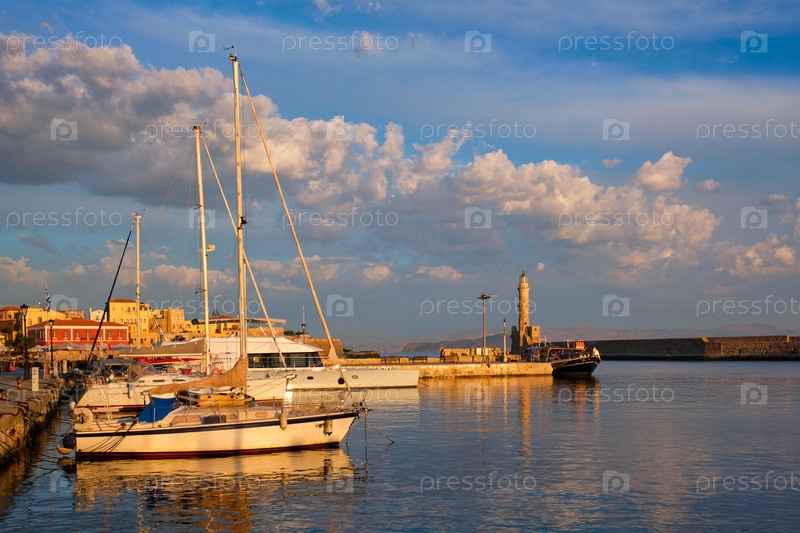 Яхты и лодки в живописном древнем порту Хании, Крит