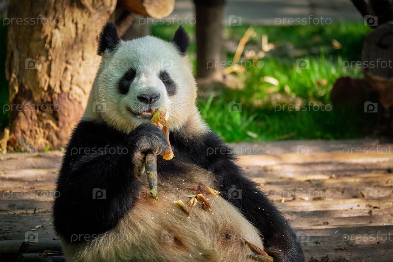 Китайский туристический символ и достопримечательность - гигантская панда, питающаяся бамбуком