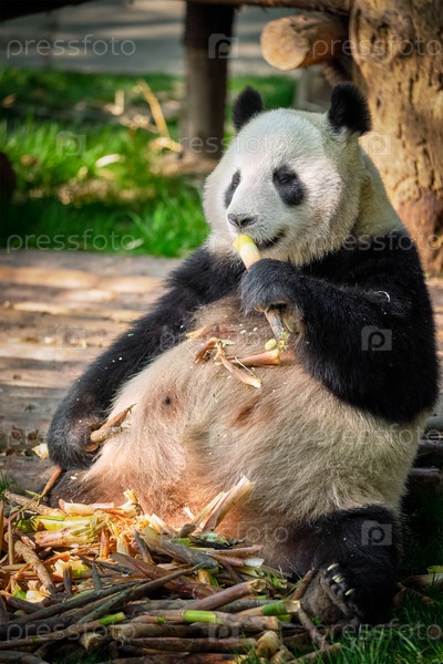 Китайский туристический символ и достопримечательность - гигантская панда, питающаяся бамбуком