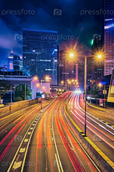 Уличное движение в Гонконге ночью.Офисные небоскребы и оживленный трафик на шоссе с размытыми пассажирскими дорожками.Гонконг, Китай