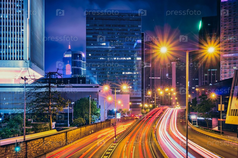 Уличное движение в Гонконге ночью.Офисные небоскребы и оживленный трафик на шоссе с размытыми пассажирскими дорожками.Гонконг, Китай