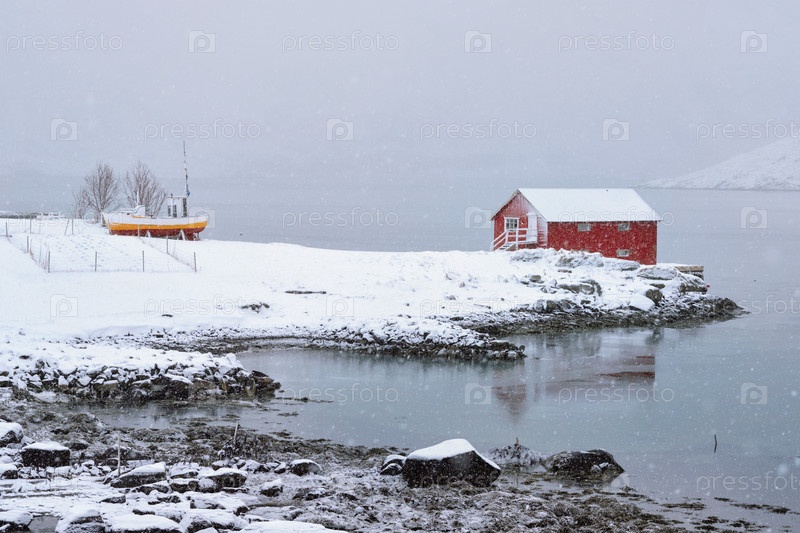 Рорбу Красный дом зимой, Лофотенские острова, Норвегия