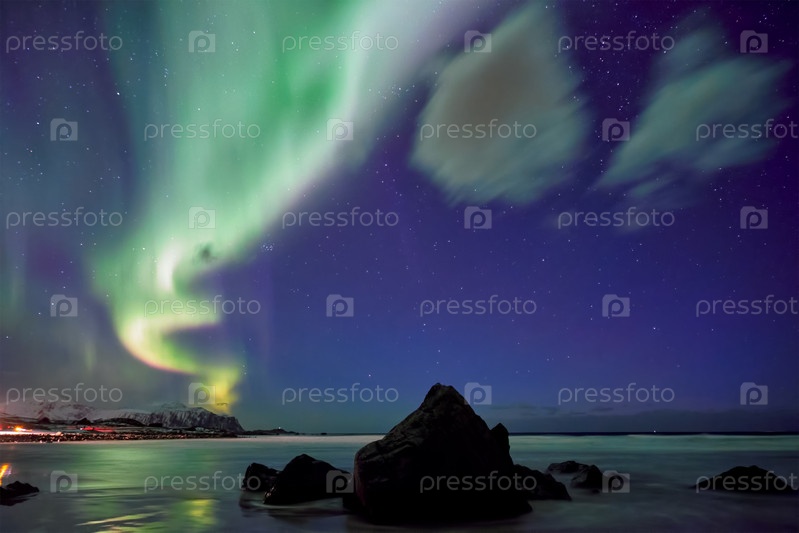 Аврора бореалис северное сияние Северное сияние Скагсандена Остров Лофотенский, Норвегия