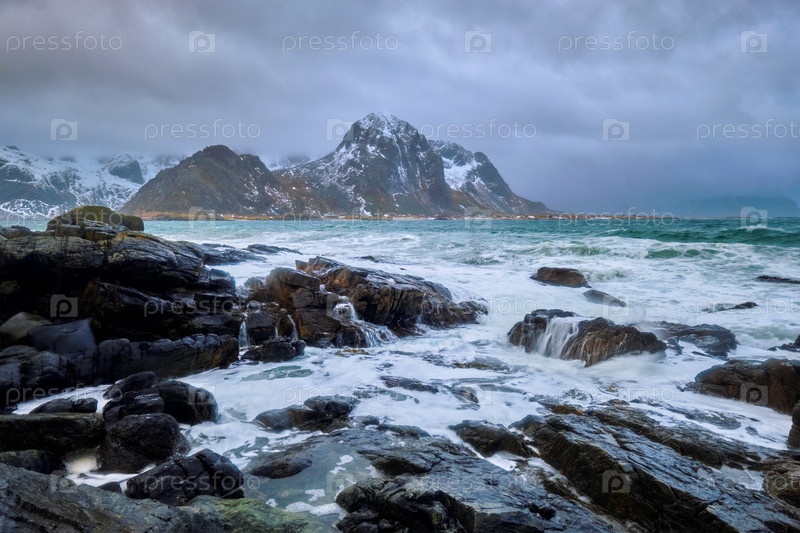 Каменистое побережье фьорда Норвежского моря зимой.Пляж Скагсанден, Остров Лофотен, Норвегия
