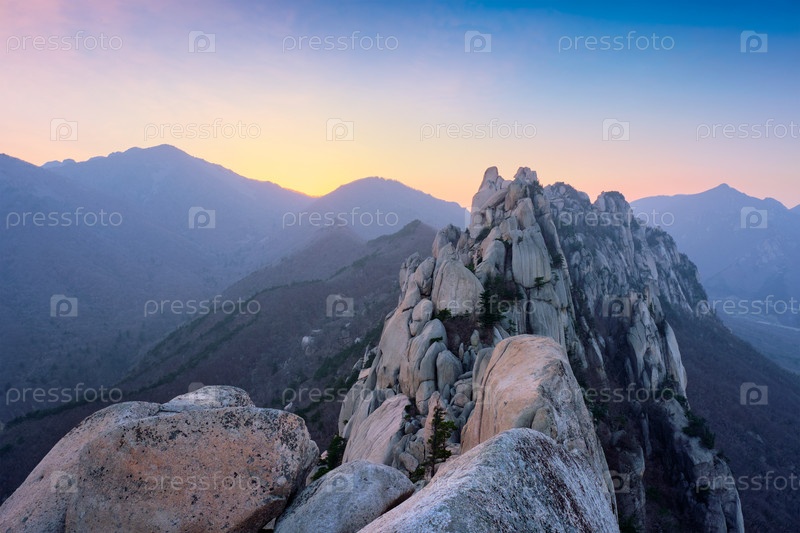 Вид на скалы и каменные образования с вершины Ульсанбави при закате солнца