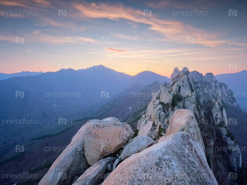 Вид на скалы и каменные образования с вершины Ульсанбави при закате солнца