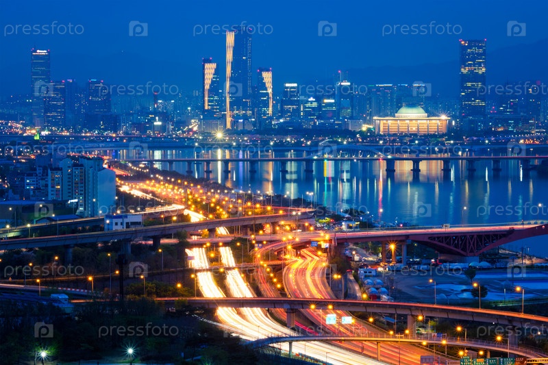 Вид с воздуха городского пейзажа Сеула и моста Сонсан через реку Хан в сумерках.Сеул, Южная Корея