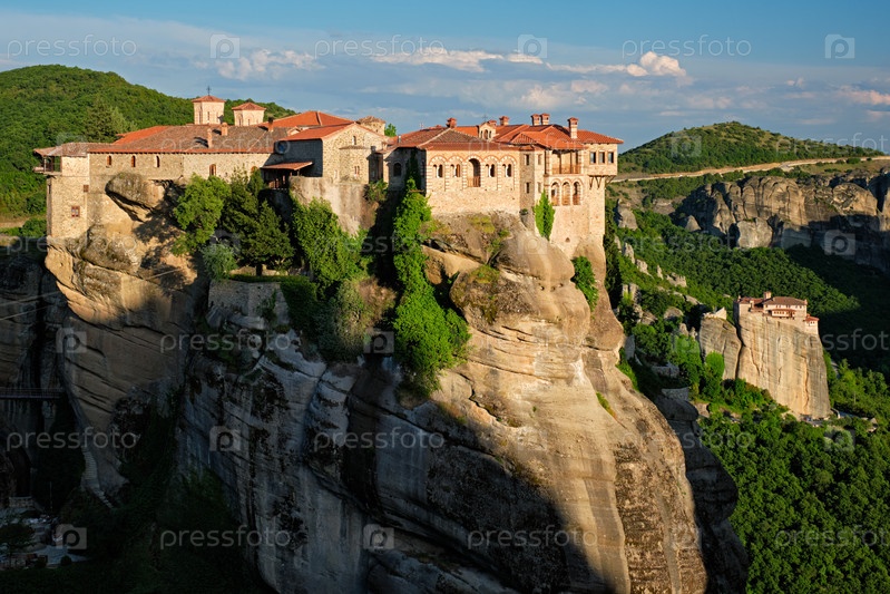 Монастырь Варлаам и Русану в знаменитом греческом туристическом месте Метеора в Греции при закате солнца с живописным пейзажем
