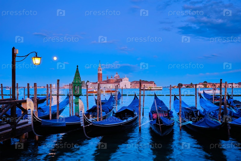 Туристическим фоном Венеции являются гондолы на площади Святого Марка (Сан-Марко) и церковь базилики San Giorgio Maggiore, которую можно увидеть через венецианскую лагуну при полнолунии
