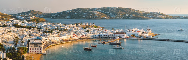 Вид на город Миконос - греческий туристический курорт с известными ветряными мельницами и портом с лодками и заходом солнца на яхте.Миконс, Кикладские острова, Греция