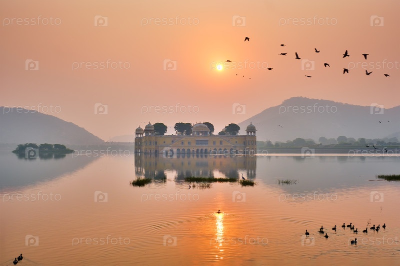 Спокойное утро в Водном дворце Джаль Махал на рассвете в Джайпуре.Раджастхан, Индия