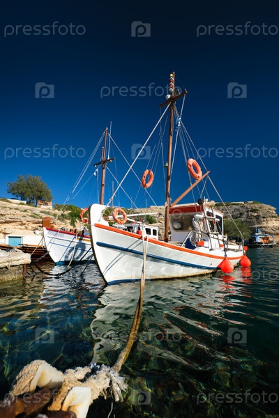 Рыболовные лодки в гавани рыбацкой деревни Мандракия, остров Милос, Греция
