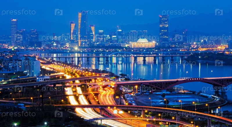 Городской пейзаж Сеула на закате, Южная Корея