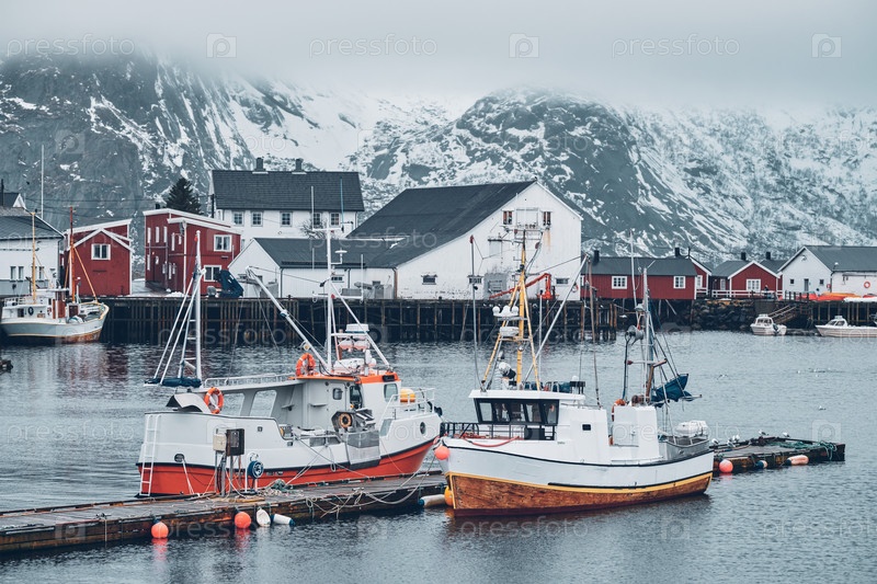 Пирс с кораблями в рыбацкой деревне Хамной на Лофотенских островах, Норвегия с домами из красного руербу зимой