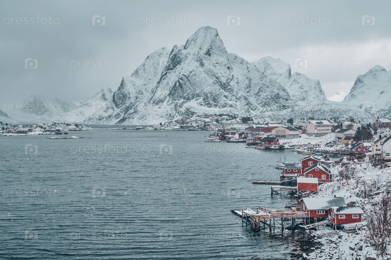 Рейнская рыбацкая деревня на Лофотенских островах с красными домами руербу зимой со снегом. Норвегия