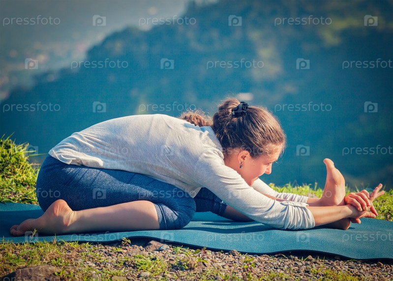 Внешняя йога - Женщина, практикующая Аштангу Виньясу Тирям-Летающую Йогу Эка-Пада Пашимоттанасана асану растягивает на открытом воздухе. винтажный ретро эффект отфильтрован из хипстерского стиля image