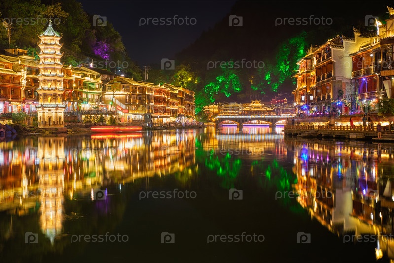 Туристическая достопримечательность - древний китайский город Фэньхуань (Феникс) на реке Тяо Цзян с Пагодой Ванмин, освещенной ночью