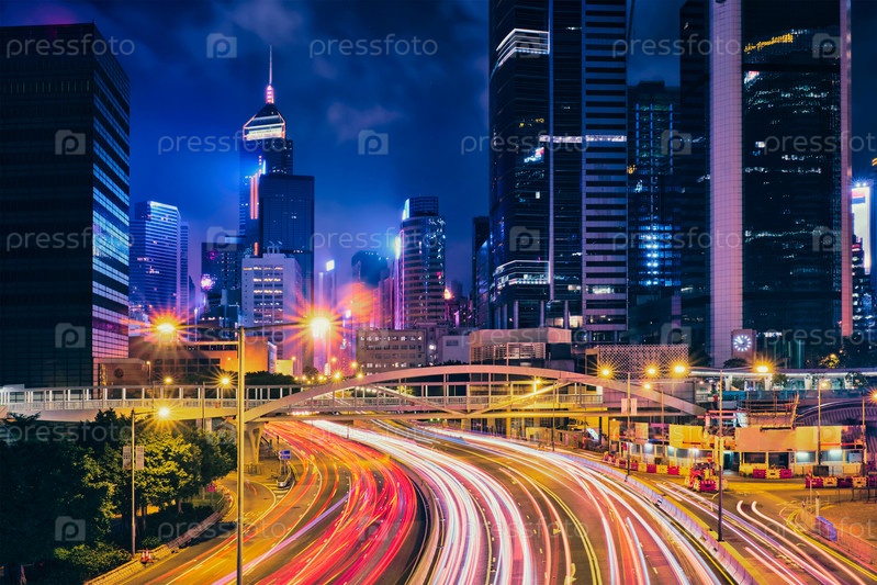 Уличное движение в Гонконге ночью.Офисные небоскребы и оживленный трафик на шоссе с размытыми пассажирскими дорожками.Гонконг, Китай