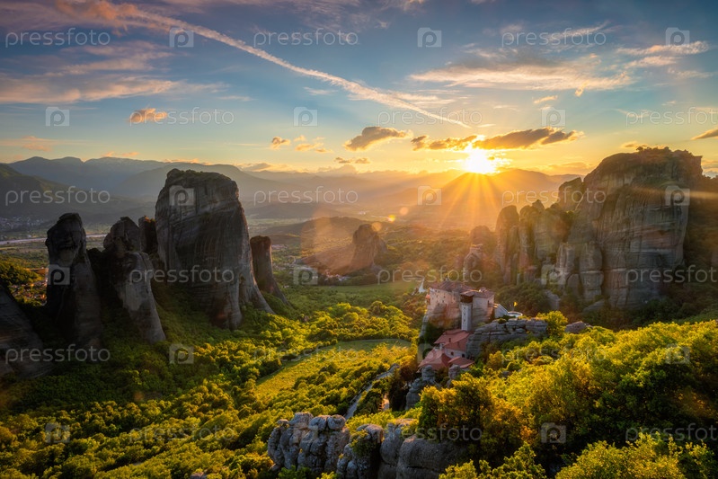 Закат над монастырем Русану и монастырем Святого Николая Анапавсы в знаменитом греческом туристическом месте Метеора в Греции при закате с солнечным светом и вспышкой линз