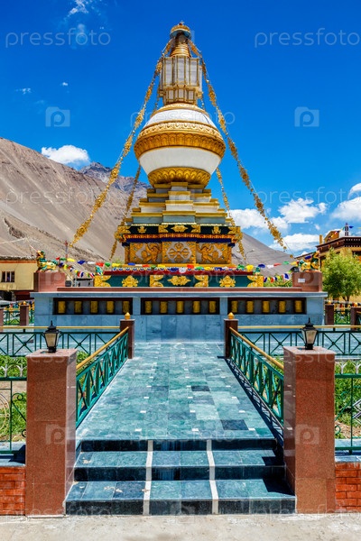 Буддистский гомпа с молитвенными флагами. монастырь Табо, Табо, долина Спити, Химачал-Прадеш, Индия