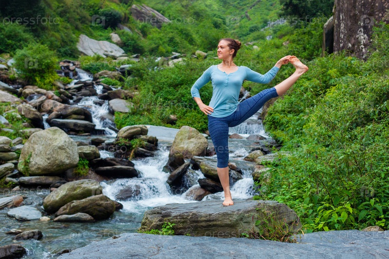 Йога на открытом воздухе - женщина, занимающаяся Аштангой Виньясой (Ashtanga Vinyasa Yoga balance asanas Utthita Hasta Padangushthasana Expanded hand-to-big nose pose in the open air near the waterfall)