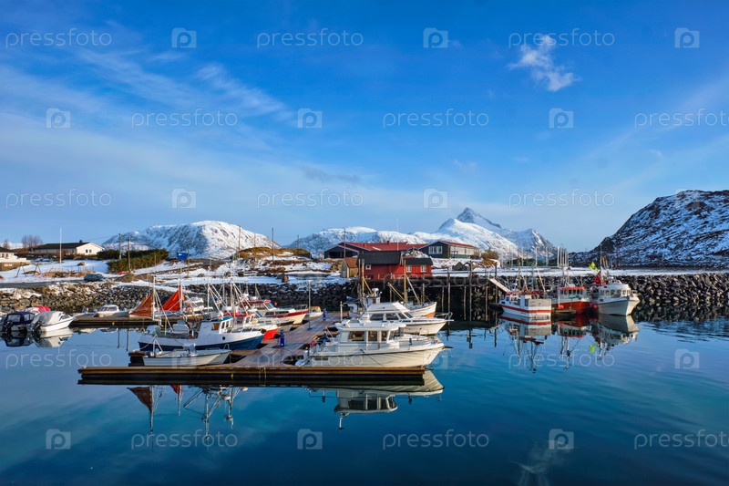 Рыболовные лодки и яхты на пирсе в норвежском фьорде в деревне на Лофотенских островах зимой, Норвегия