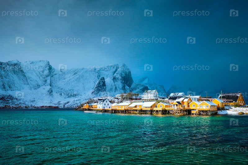 Желтый дом руербу рыбацкая деревня Сакриса со снегом зимой Острова Лофотен, Норвегия