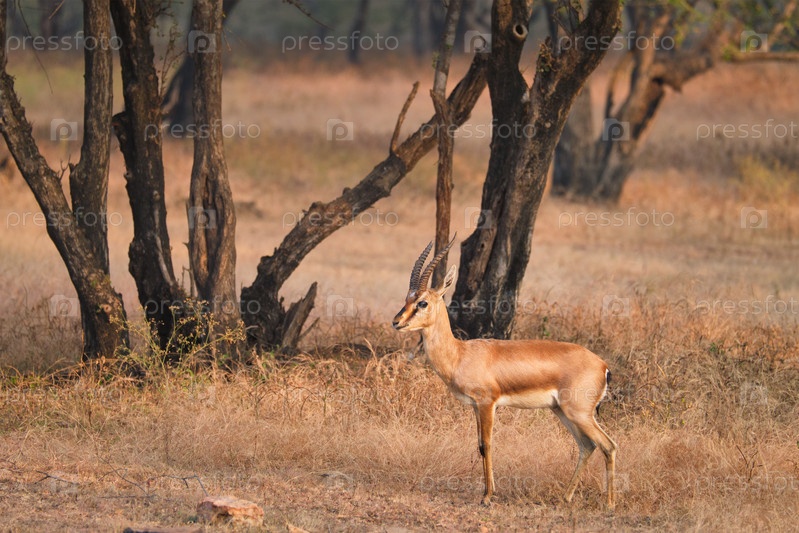 Молодая индийская газель Беннетти или чинкара гуляет и пасется в лесу Национального парка Ратнамбор Экологическая среда туризма Раджастхан, Индия