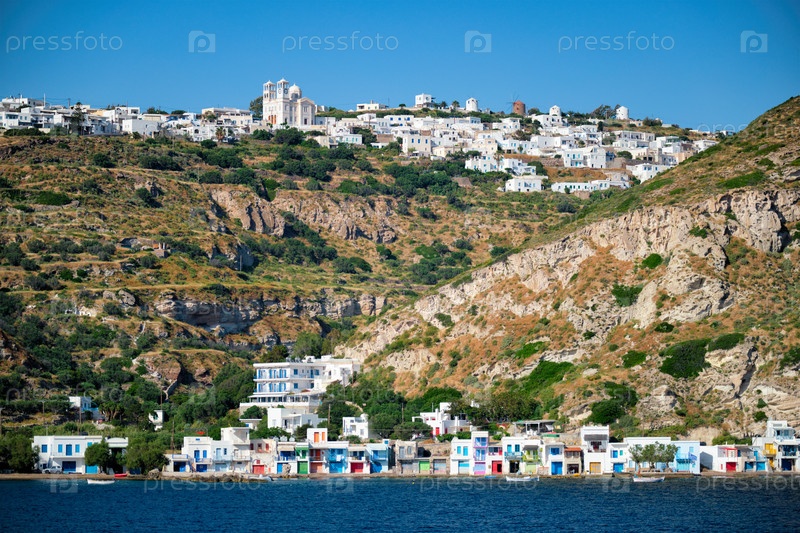 Деревни Клима и Плака с традиционными домами, православная церковь и ветряные мельницы на острове Милос в Греции